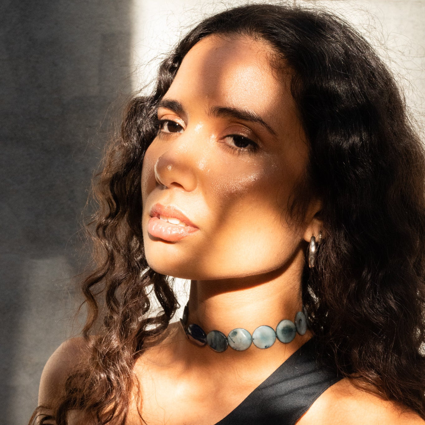 A delicate choker featuring natural blue mother-of-pearl beads and beautiful kyanite