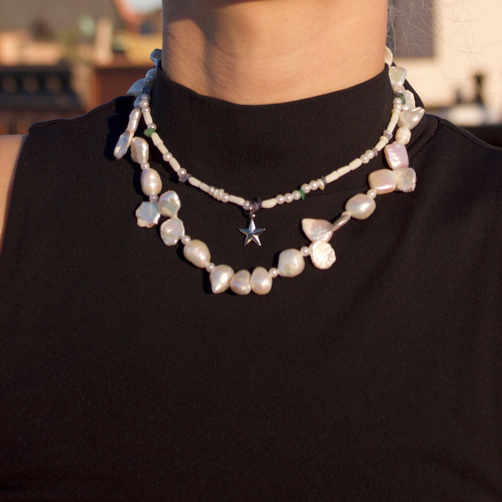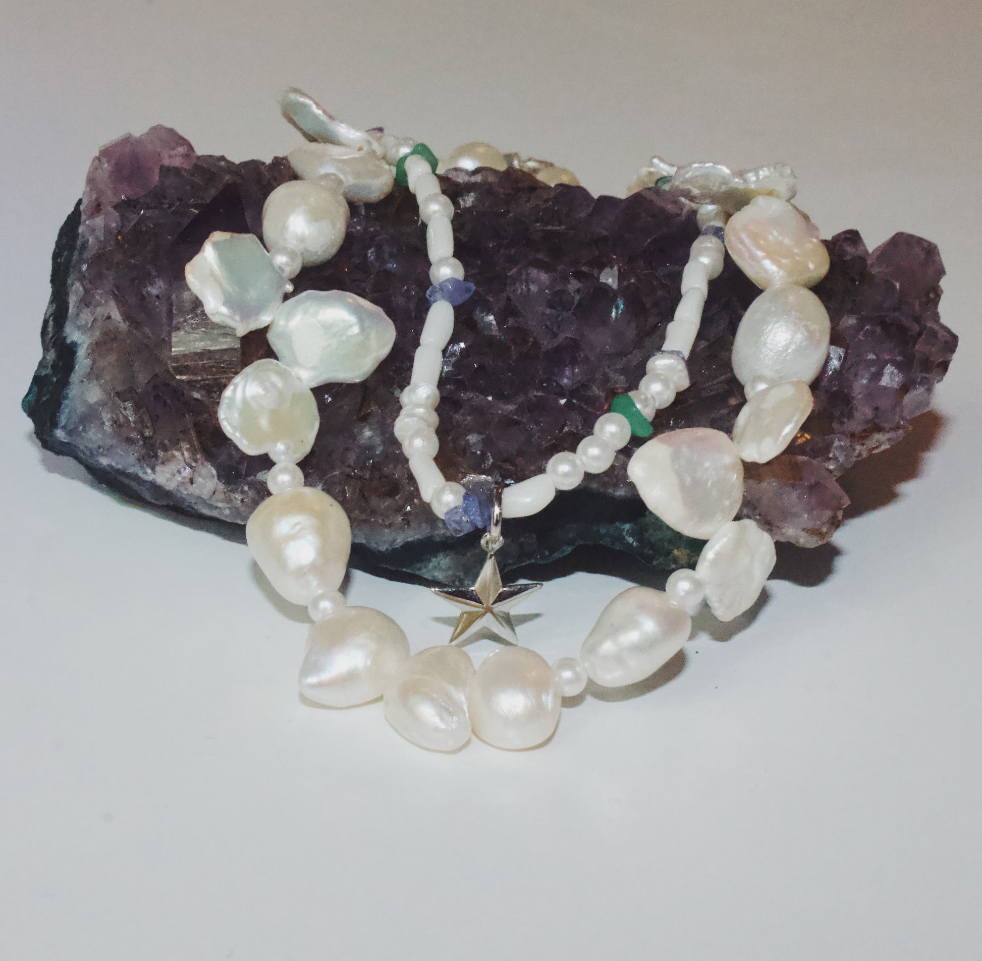 A unique double necklace featuring a beautiful blend of bone beads, tanzanite, mint agate, and a carefully curated selection of baroque pearls.