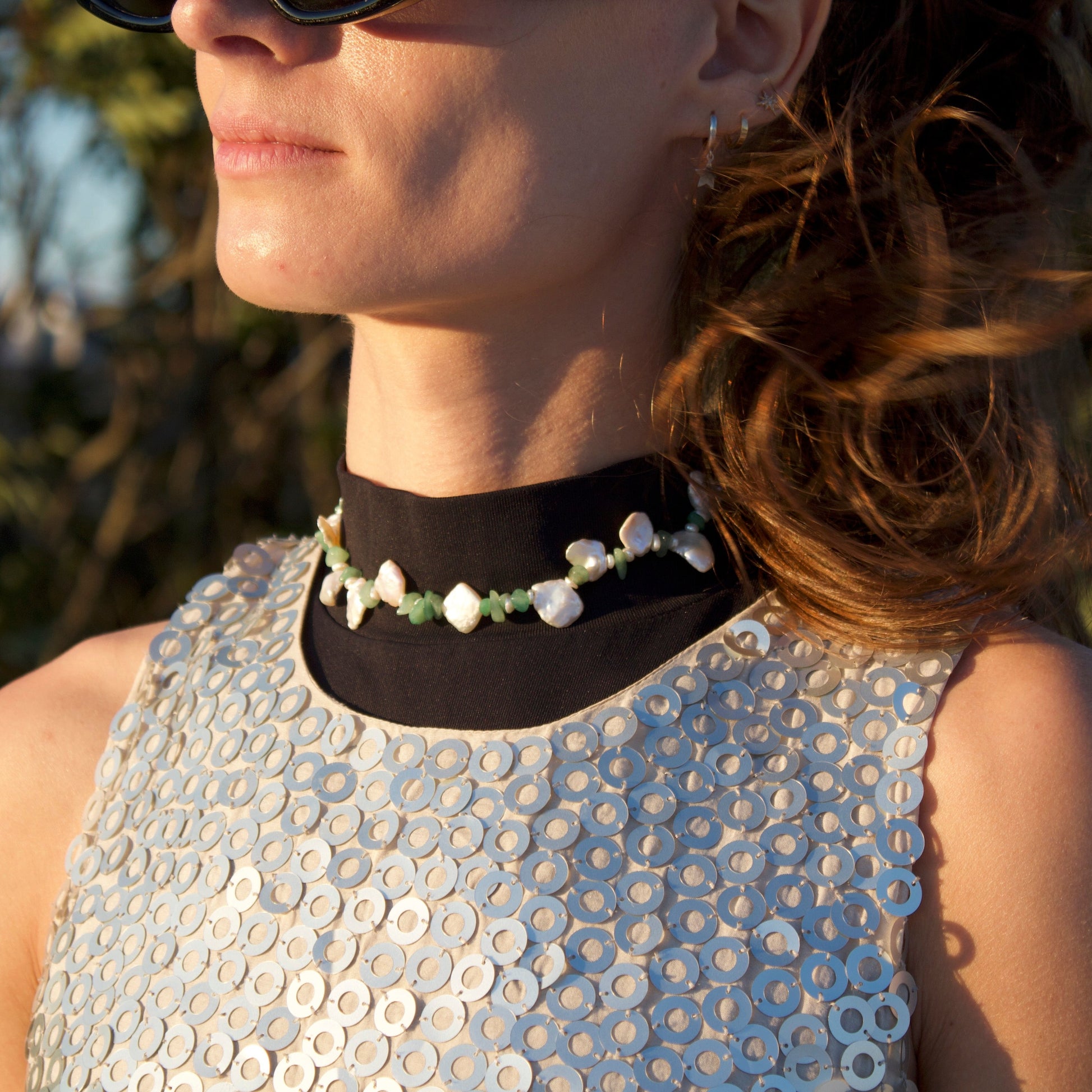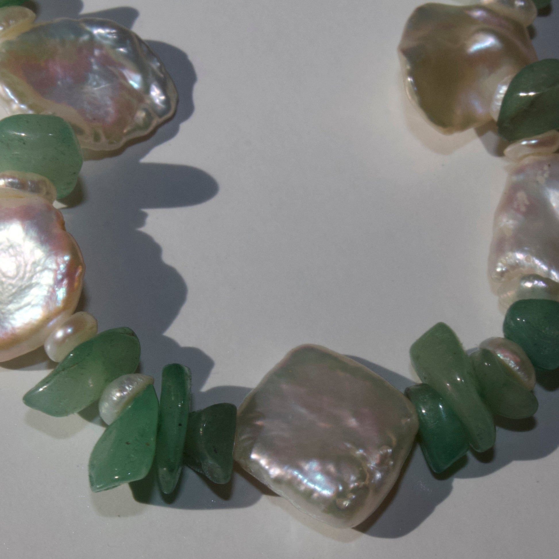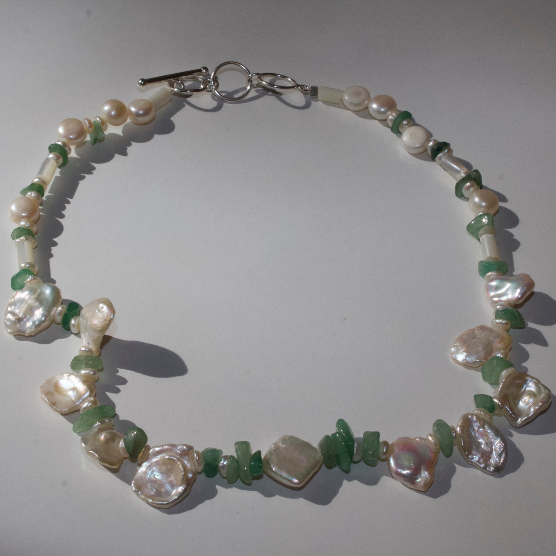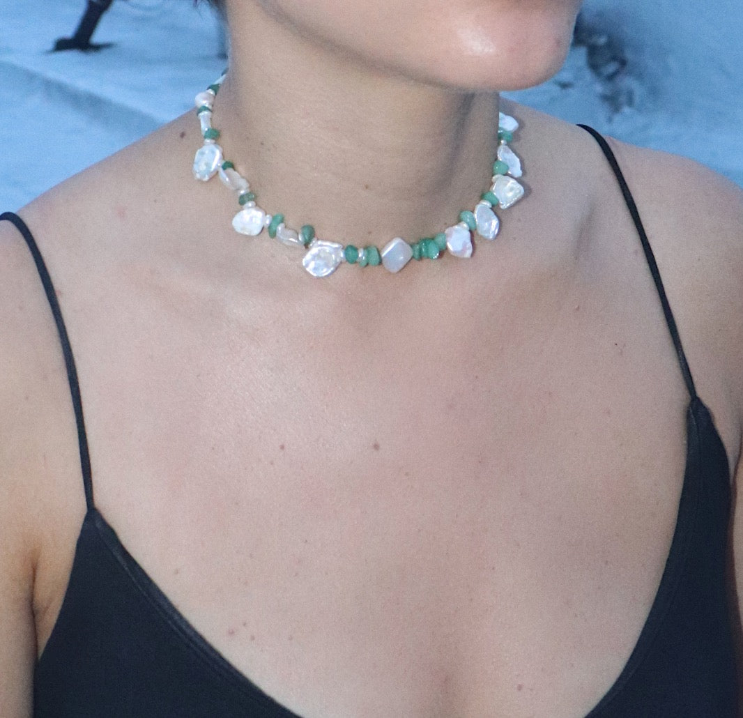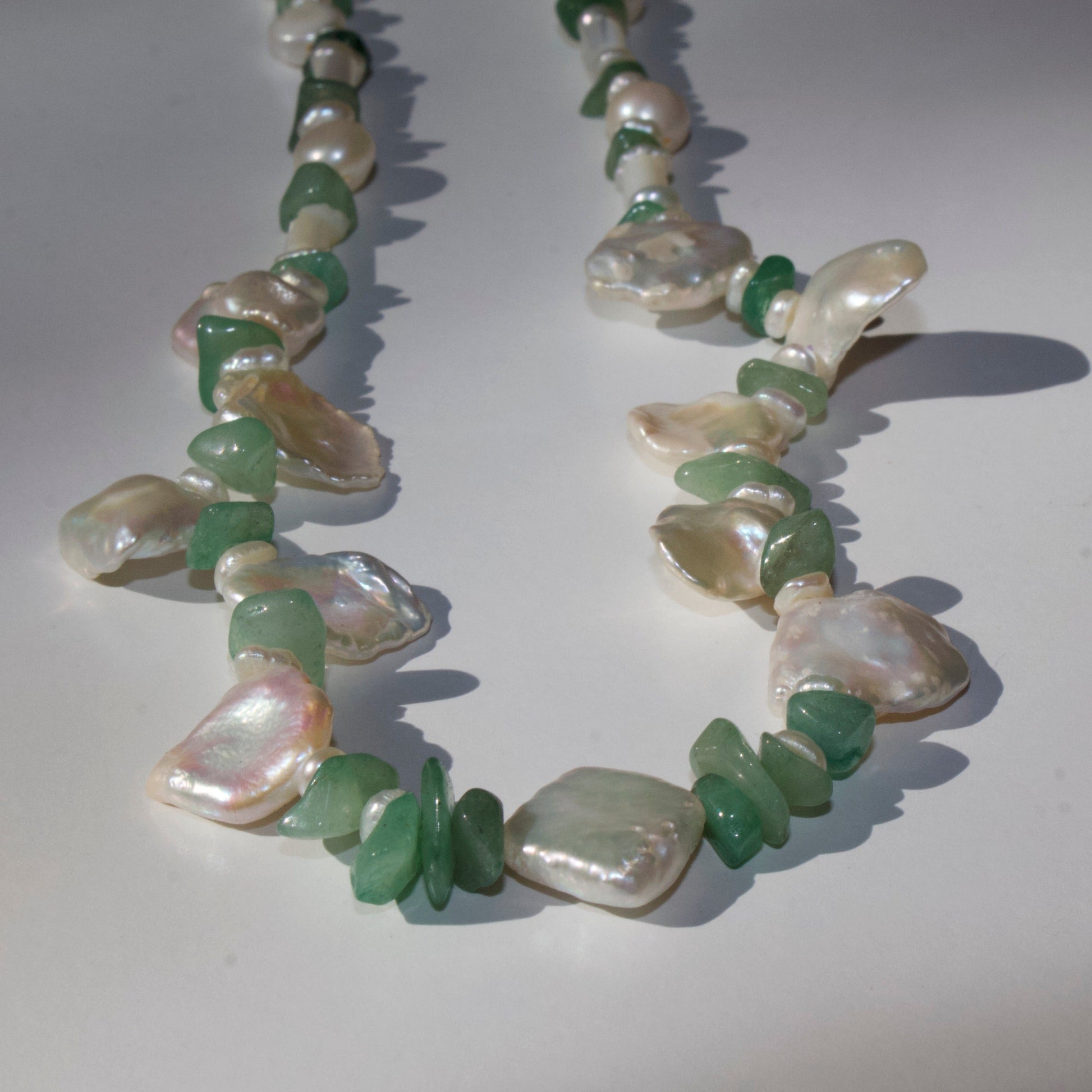 A unique design featuring a curated selection of baroque pearls and mint agate, blending elegance with natural beauty.