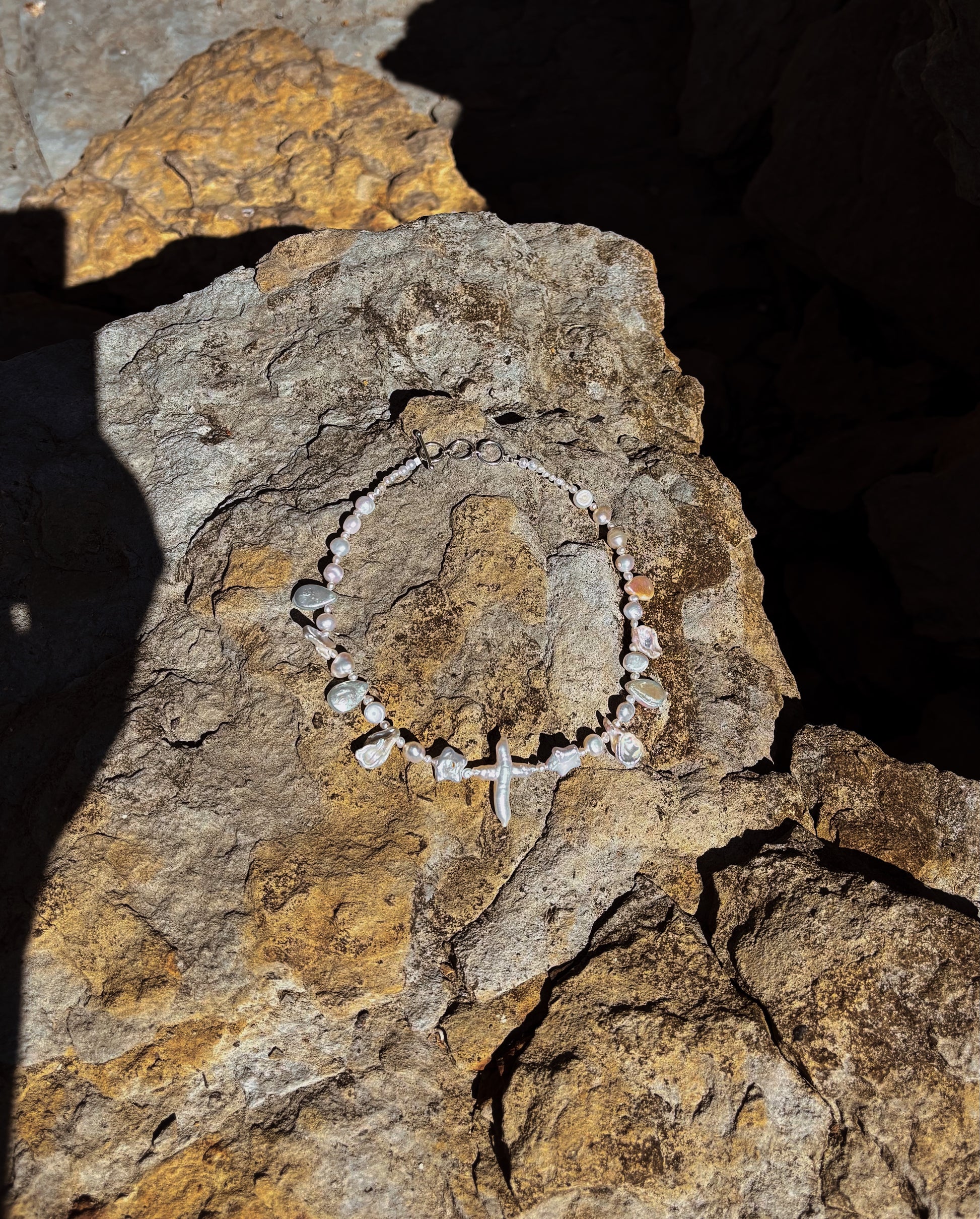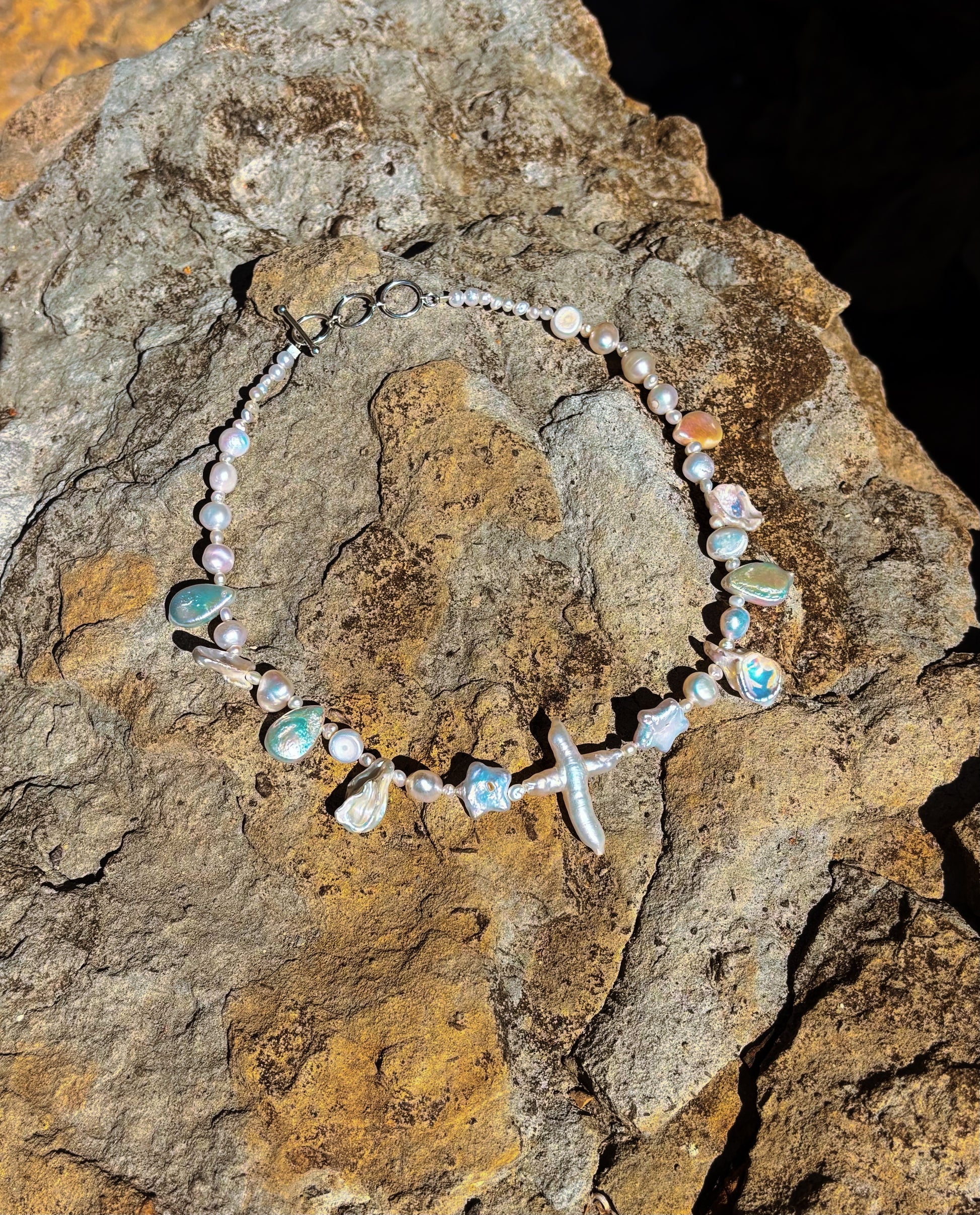 A tribute to the ocean’s magic, the Sereia Necklace blends the organic elegance of baroque freshwater pearls with cross and star-shaped pearls