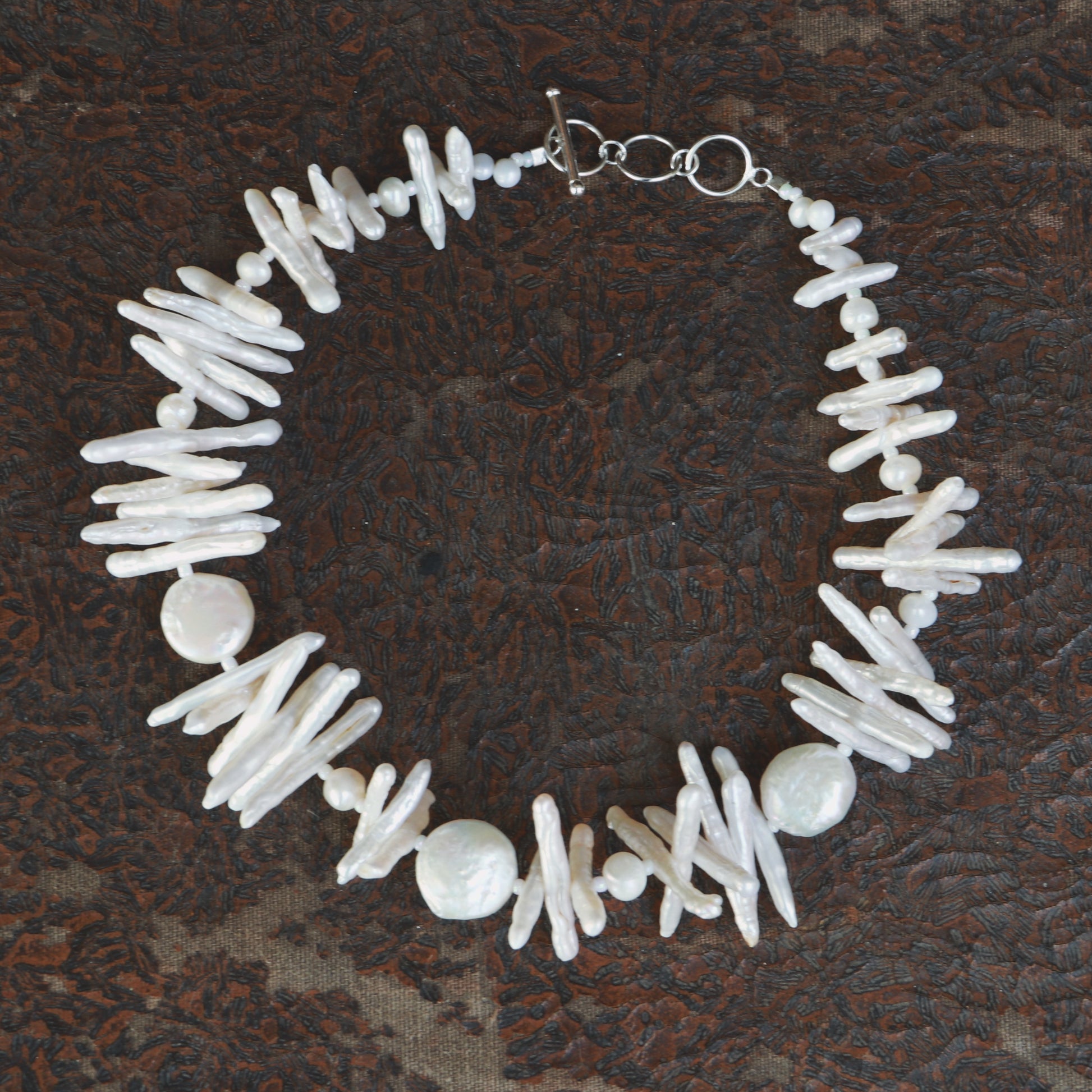 14-inch Necklace featuring elongated baroque pearls paired with luminous coin pearls for a beautifully organic contrast of shape and texture. Its shorter length sits elegantly at the neckline, offering a refined yet natural statement. Finished with a sterling silver adjustable clasp for a customizable, comfortable fit.
