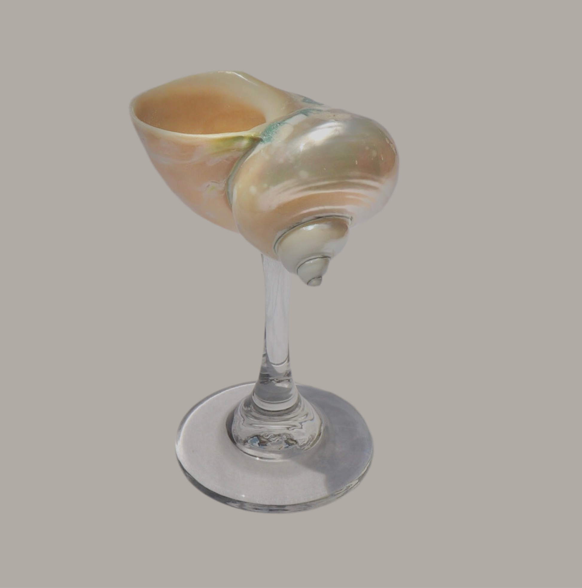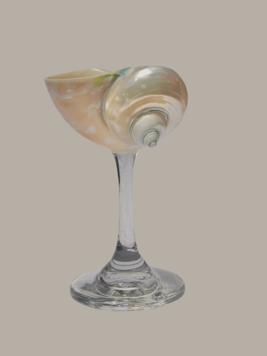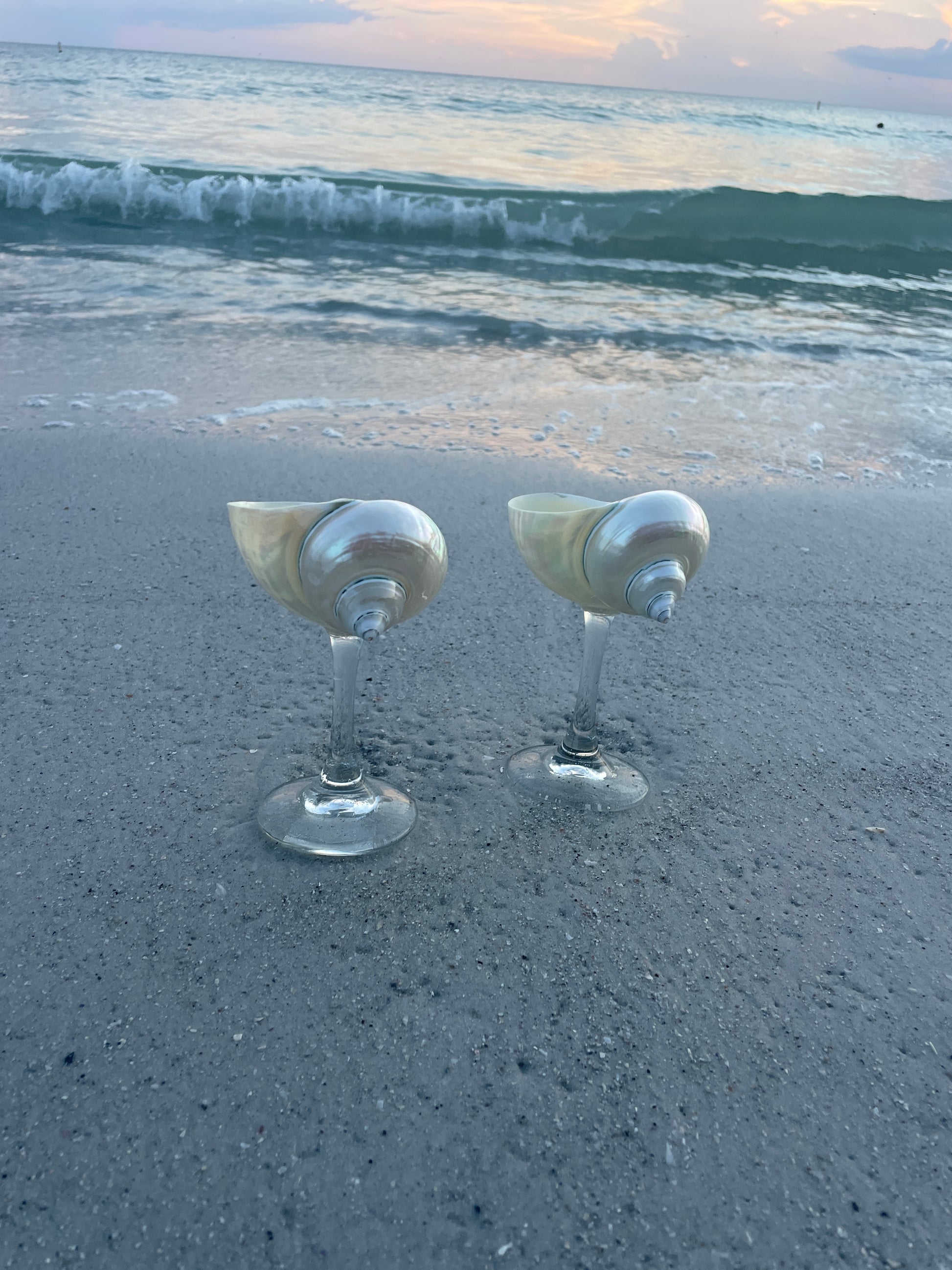 Individually crafted seashell glasses made with natural shells delicately bonded onto a glass base.